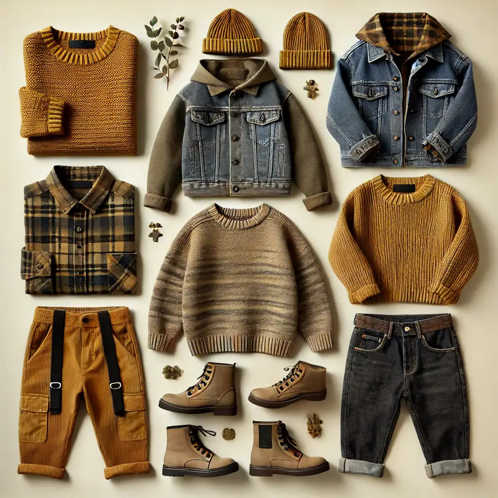 DALL·E 2024-09-13 20.17.21 – A photorealistic visual guide for fall photoshoot outfits specifically designed for boys. The outfits feature earthy tones like mustard yellow, olive